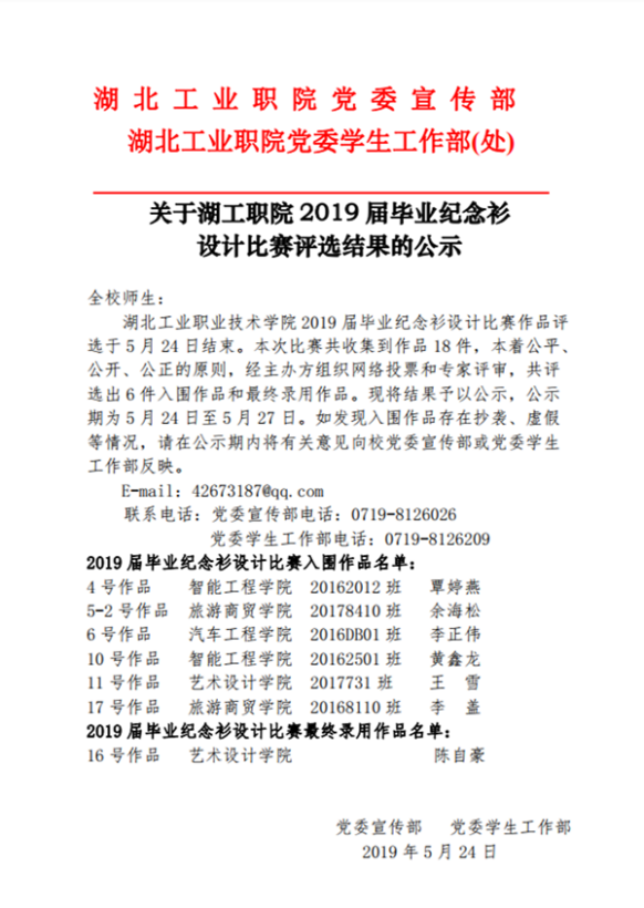 关于湖工职院2019届毕业纪念衫设计比赛评选结果的公示