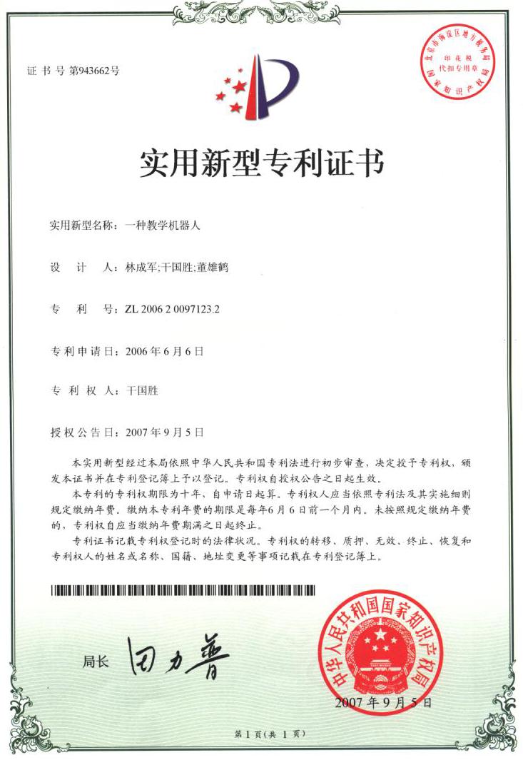 据专利所有者干国胜副教授介绍,这种教学机器人的研制全部都是独立开发,每一个零件都是他们自己焊接安装的,拥有自主知识产权,该项技术属国内领先水平,除了教学机器人本身就可以作为产品进行推广应用外,它其中所包含的每一个单项技术都可以在人工智能等自动化领域发挥作用。