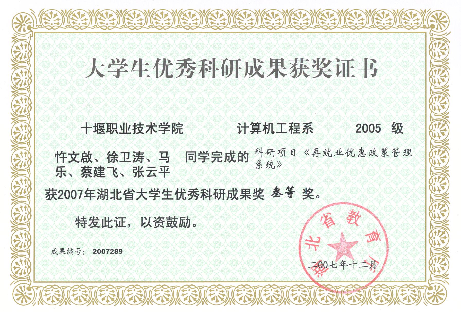我系学生荣获湖北省大学生科研成果奖(2008-02-24)