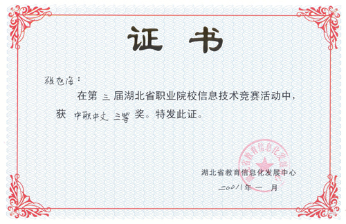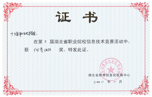 新闻网讯 近日,湖北省教育信息化发展中心表彰了湖北省第三届职业院校信息技术竞赛获奖单位及选手,滚球买球计算机工程系学生张旭海同学获高职中文类三等奖,经济贸易系学生徐金凤同学获高职英文类三等奖,计算机工程系学生邓浇华、黄芳、王芳、经济贸易系学生管海翠、林宽同学获高职中文类优秀奖,十堰职业技术学院获优秀组织奖。
