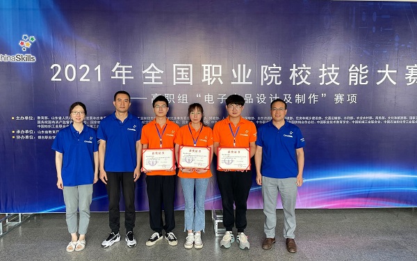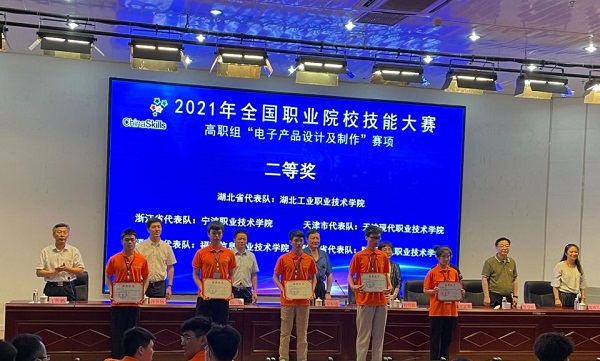 新闻网讯(通讯员王俊亚)6月20日,2021年全国职业院校技能大赛高职组“电子产品设计及制作”赛项在烟台职业学院闭幕,由滚球买球滚球买球的app官网应用电子技术专业刘竹林技能名师工作室(王庐山、刘竹林、王俊亚)指导,胡昌、卢存勇、周紫欣同学组成的技术团队代表湖北省参赛,他们与全国27所代表本省最高水平的顶尖院校选手同台竞技,经过连续8小时的激烈角逐,最终获得该赛项二等奖第1名的好成绩。