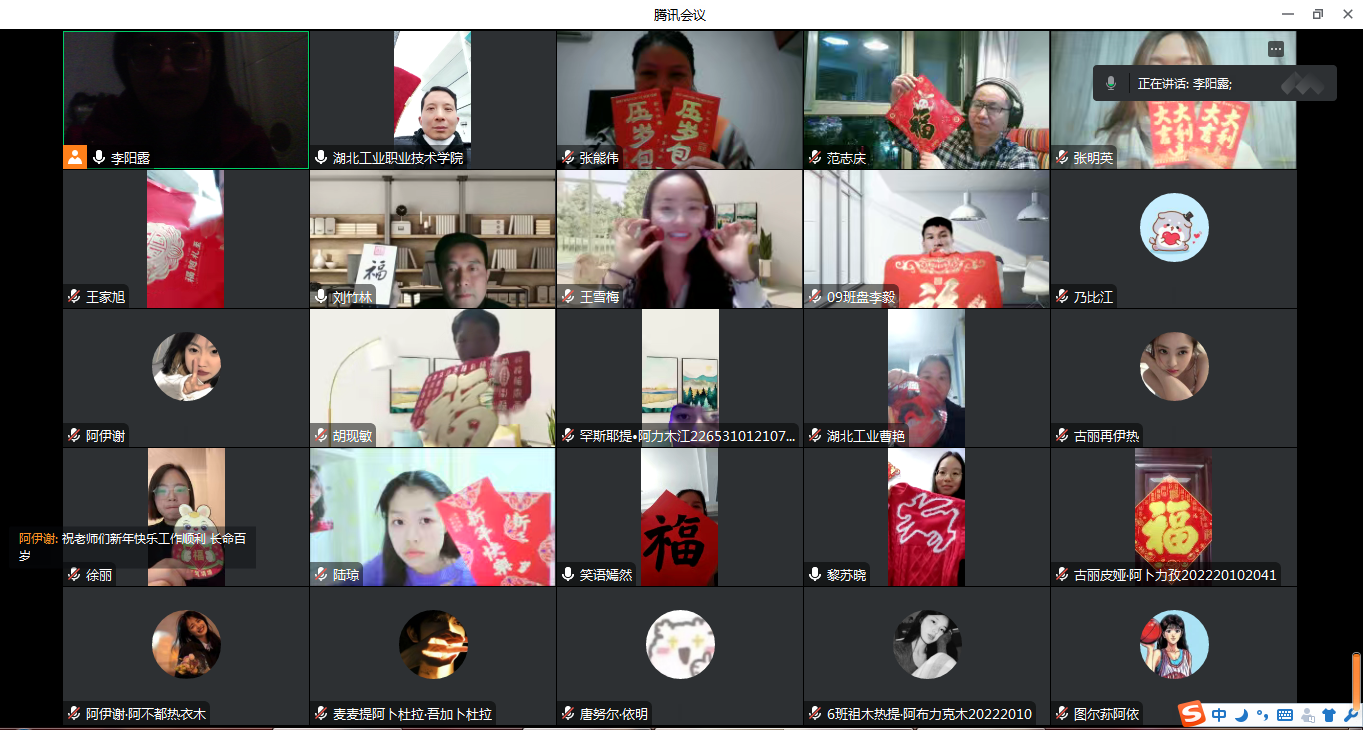 会上,杨凤(苗族)、张明英(土家族)、阿伊谢·阿卜力米提(维吾尔族)、乃比江·阿布都热西提(维吾尔族)等同学分别介绍了自己的假期生活和新学期学业规划,表达了对老师和同学们的新春祝福。2022级祖木热提·阿布力克木同学还谈到疫情期间的在线教学,表示一开始有些不适应,但是通过老师的帮助和自己的努力,目前已经没有困难了,盼望早点儿开学回到校园。