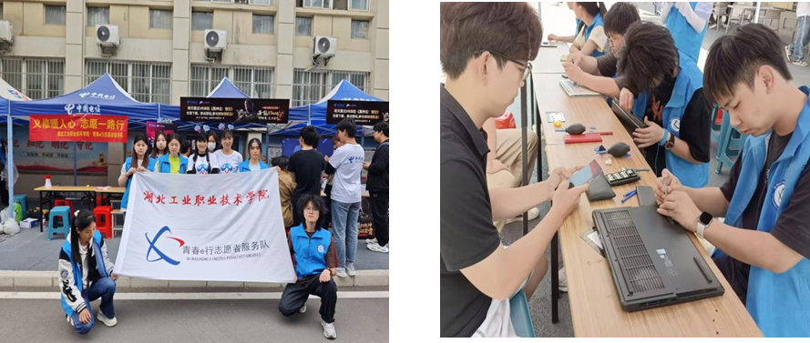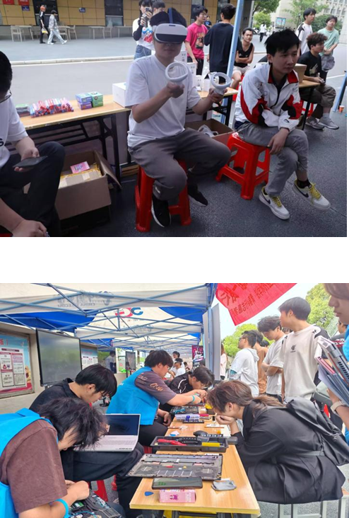 将专业优势转化为服务特色,是“青春e行”的鲜明标签。4月26日,服务队联合中国电信打造的"科技服务日"吸引了众多师生参与。活动创新设置VR体验区和电脑维修区两大板块:在VR体验区,通过沉浸式游戏和专业讲解,让参与者感受虚拟现实技术的魅力;在电脑维修区,志愿者们凭借专业技能,为师生提供系统优化、病毒查杀等贴心服务。这种“体验+服务”的创新模式,既普及了科技知识,又解决了实际问题,赢得师生一致好评。