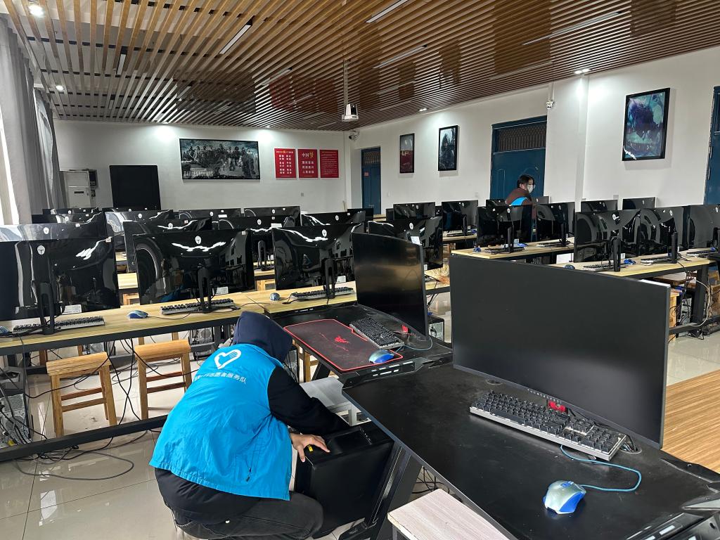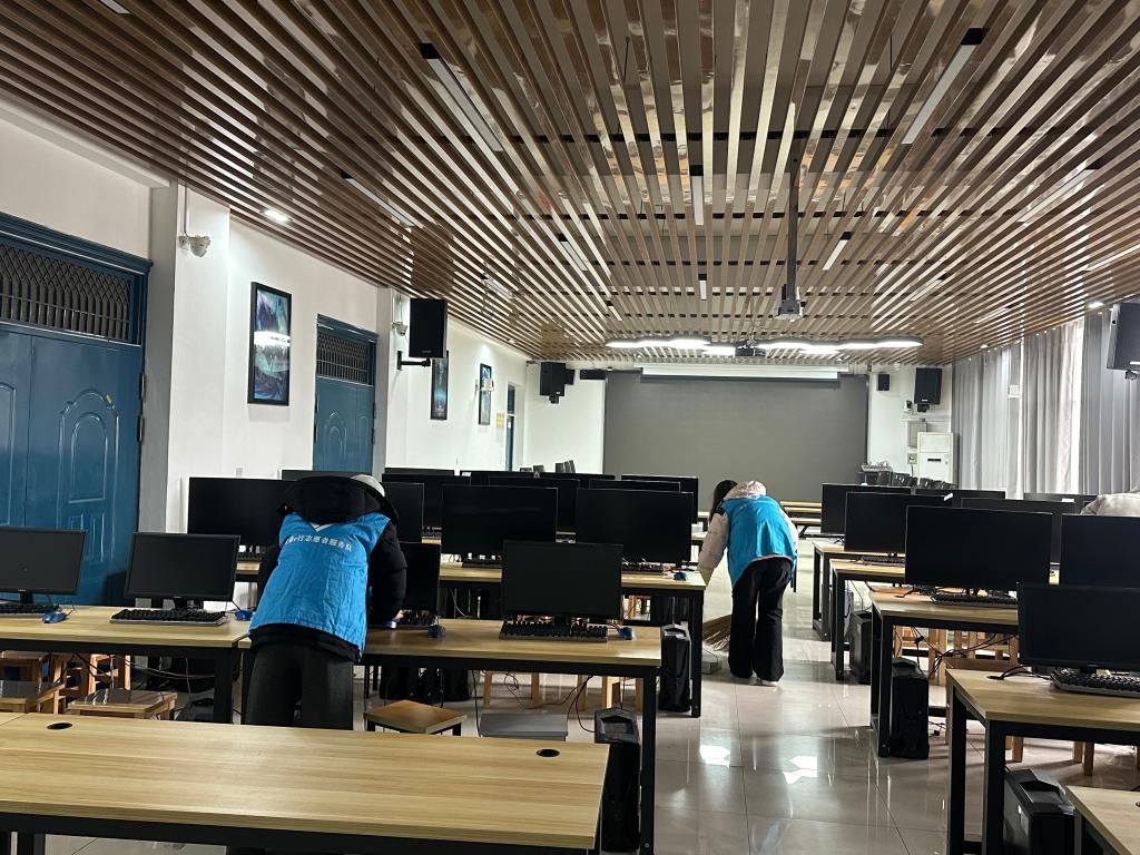 活动筹备阶段,志愿者提前到岗,在负责人统筹下有序分工,领取清洁工具。统一的蓝色志愿服,在整齐的设备间形成一道亮眼风景线。清洁过程中,志愿者们各司其职、默契协作,俯身清理桌角地面积尘,排查卫生死角;用软毛刷清扫键盘缝隙,以微湿抹布擦拭显示器与主机;同时梳理杂乱线路,巧用棉签处理顽固污渍,全程轻拿轻放、细致严谨。